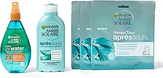 Garnier Ambre Solaire - Coffret Protection Solaire Complète - 1 Spray Biphase Invisible FPS 50 (150 ml) - 1 Lait Hydratant Apaisant Après Soleil à L'Aloé Vera (200 ml) - 3 Masques Tissu Après Soleil