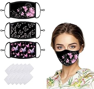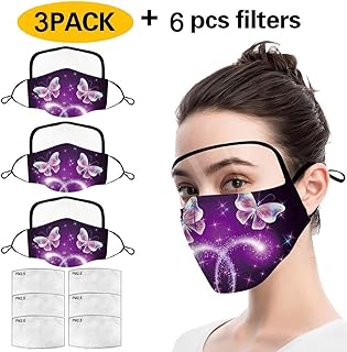 QQQQ Lot de 3 bandanas lavables réutilisables Motif papillons avec bouclier pour les yeux + 6 filtres, respiration buccale réglable et résistante à la poussière pour homme et femme
