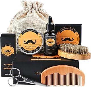 Kit Soin Barbe Complet Set pour Hommes Croissance Entretien et Toilettage Hydratant avec Shampoing Barbe,Huile Barbe,Baume Barbe, Brosse Barbe, Peigne Barbe, Ciseaux Barbe, Cadeau Original pour Homme