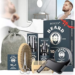 Kit Barbe pour Hommes,10Pcs,Kit Soin Barbe Complet de Soin et Toilettage-Barbe Shampoing,Huile Barbe,Barbe coiffant Peignes,Raser,Brosse a Barbe,Baume à Barbe,Ciseaux,Sac,Manuel,Cadeaux pour Homme